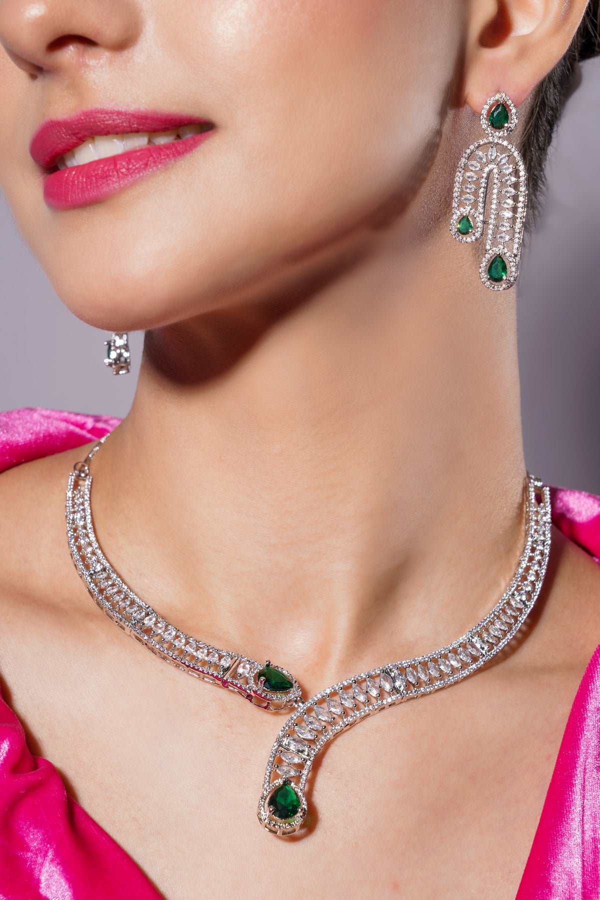 Amaita Platinum Finish Emerald Curve Design Jewellery Set