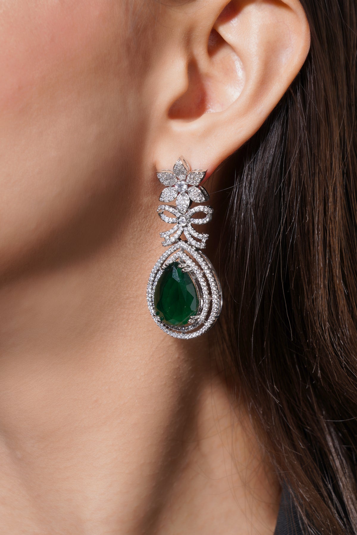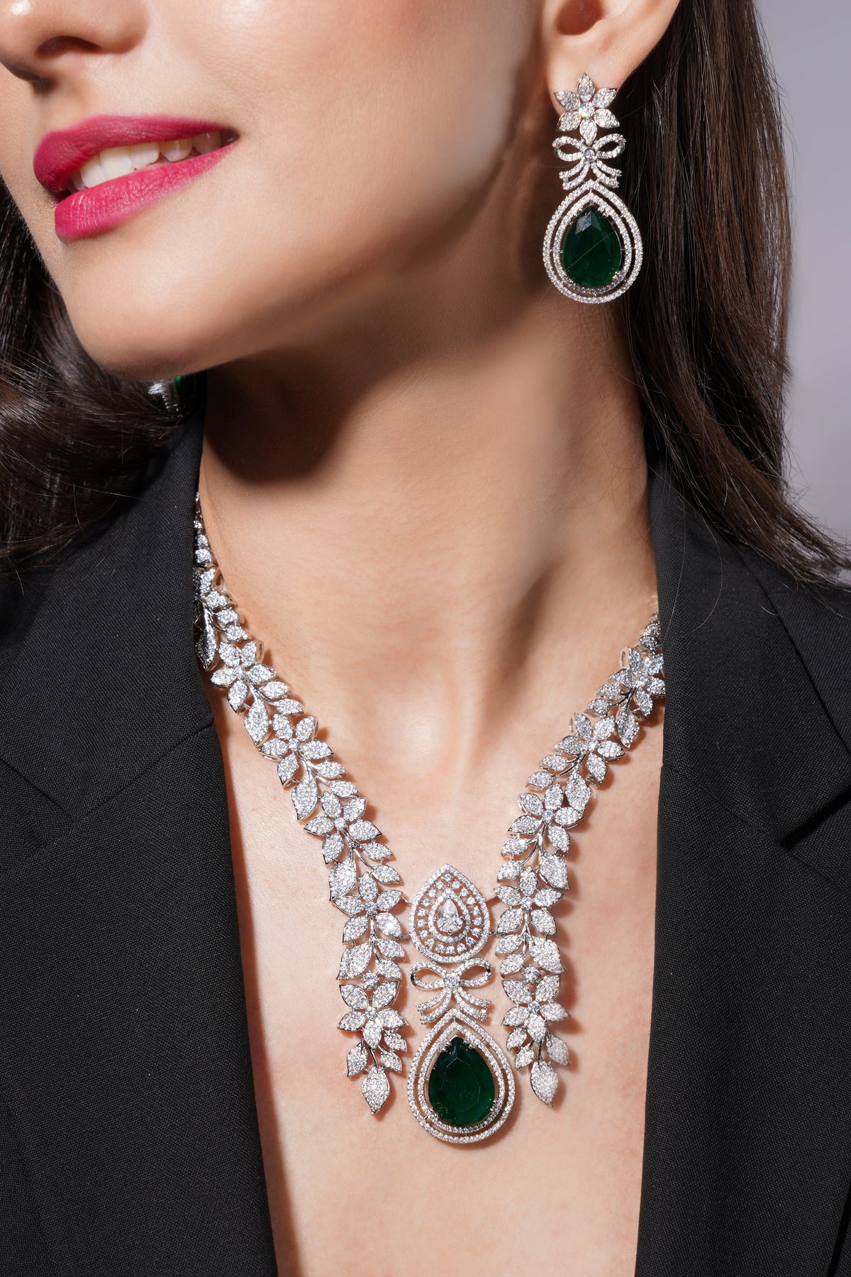 Amaita Platinum Finish Emrald Green Stone Leaf Design Luxe Jewellery Set
