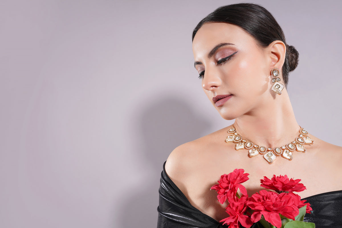 Amaita Gold Finish Kundan Stone Ivory Frame Necklace Set